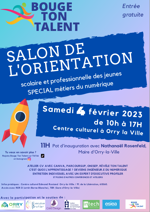 Découvrez l'Association Bouge Ton Talent. Bouge Ton Talent est dédiée à aider les jeunes dans leur orientation. Leur principale initiative est l'organisation d'un salon de l'orientation à Orry-La-Ville chaque année. En 2023, le salon a porté sur les métiers du numérique. Cette année, il a été consacré aux métiers de la transition écologique. Les participants ont pu découvrir plusieurs stands. Ces stands ont été organisés par des entreprises, des écoles, des universités et des professionnels. Des conférences sur le thème de l'année ont également été proposées.